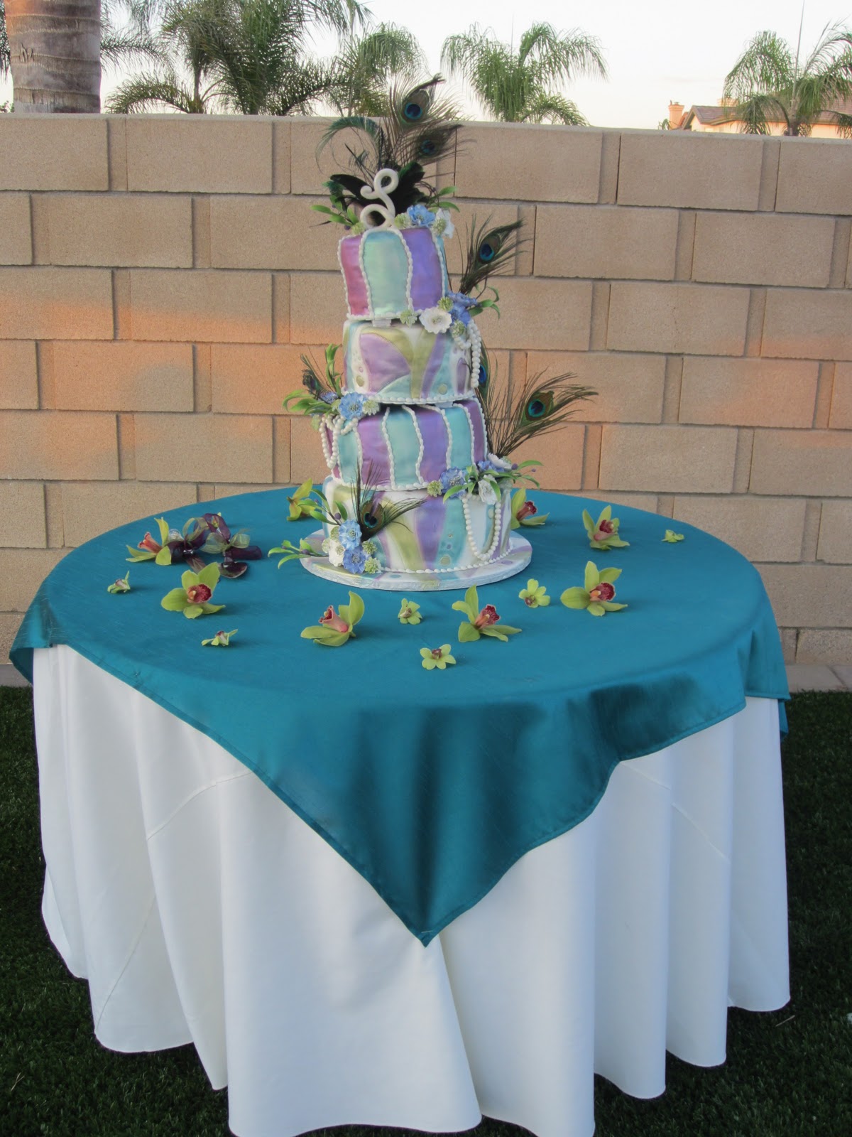 Denae wanted a peacock feather theme for her reception. The cake was a topsy turvy with the feathers and orchids.